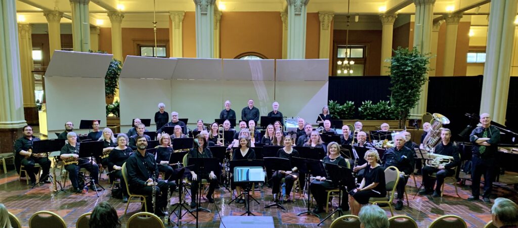 The band performs a wide variety of music, including symphonic band arrangements, marches, classical works, dixieland, big band, musical theatre, original compositions, and instrumental with vocal solos.